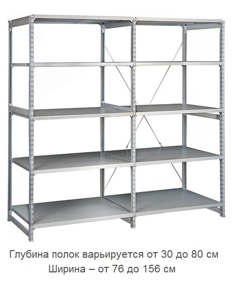 - Металлические полки с максимальной нагрузкой на полку – 150 кг или 300 кг (усиленные полки)