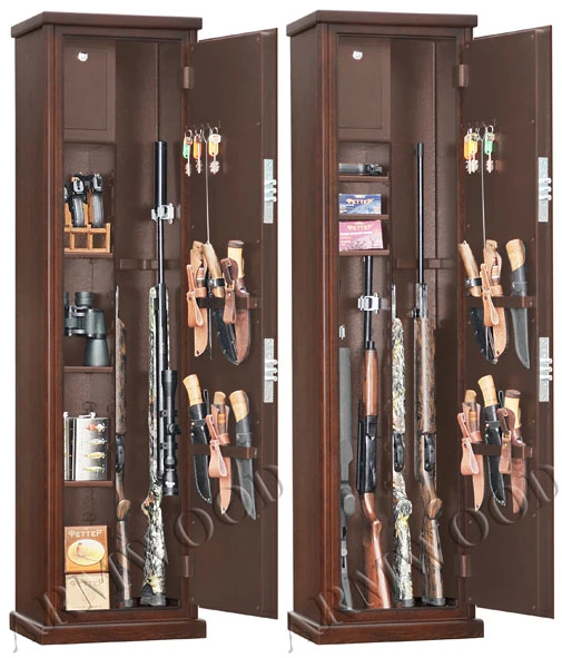 - Внутри сейфа есть запираемое (патронное) отделение и деревянные ложементы, можно дополнительно установить три съёмные полки (если полки не устанавливать в сейф помещается 4 ствола).